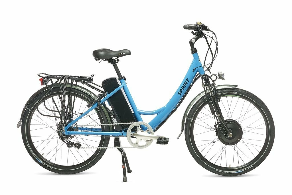 The Ezee Sprint is an all-rounder electric bicycle for men and women. With a convenient step-through frame and plenty of user-friendly features, this bicycle will makeΒ cycle commuting, shopping and city riding hassle free. The robust compact hub gears and puncture-resistant tyres reduce maintenance problems and no more recharging batteries for your bike lights! Equipped with centre mount double leg kick stand, mud guards, rear rack, speedometer and front and rear lights.