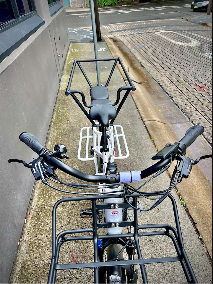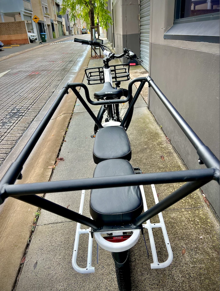 Built around a nice upright riding position and an adjustable handlebar stem these are designed to be ridden all day. The low stepover height plus a 400mm seat post means riders can be between 160-200cm in height. Thereโs enough room on the back for 3 kids (without the kids seats) and it comes with padding for the rear rack. The monkey rear rail bars and front basket rack are also included.