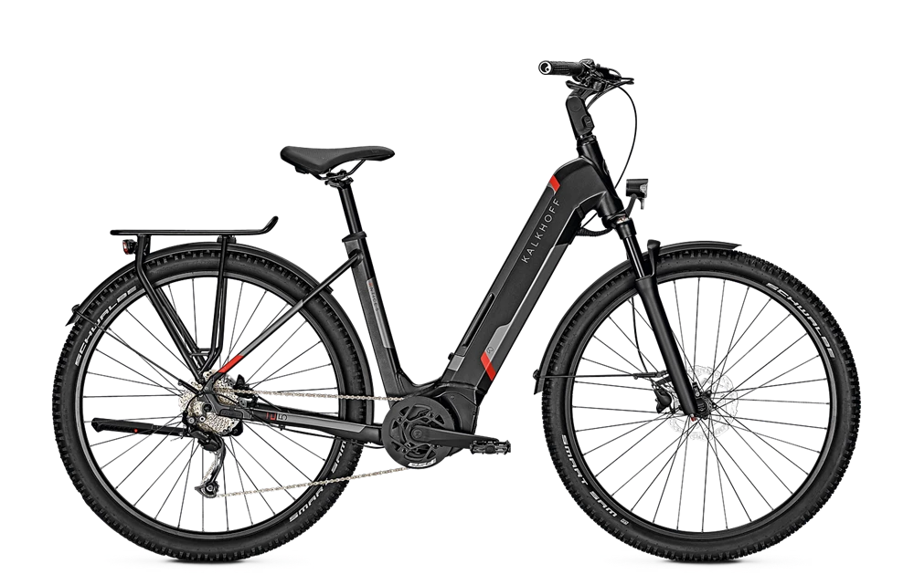 Just get on your bike and get ready to enjoy your freedom. That is what the Entice 5 is all about. No matter whether you are on a holiday tour in the Alps, or negotiating urban cycleways in London β our everyday and yet sporty off-road trekking e-bike is just as much at home in hectic city traffic as on lonely gravel paths. Thanks to its SUV concept, it even masters more demanding off-road trips with flying colours. Comfortable. Safe. Sporty. With its Nordic Kalkhoff look and fully integrated battery, it is the versatile all-rounder for more cycling pleasure each and every day. In 2022, the Entice 5b appears more powerful than ever. Its motto is: Maximum cycling pleasure. All standard models have reinforced frames and pannier rack and, with a loading capacity of up to 170 kg, are ideal for anyone who likes to travel with trailers, panniers or other heavy loads. Maximum comfort is also guaranteed by the new low step-through geometry which makes it easy to get on and off, and the raised handlebar position for a more upright sitting position. It also goes without saying that all models use the latest Bosch drive technology. Exciting: The SUV design with 29-inch wheels will give you a smoother ride, the wide MTB knobbly tyres provide extra grip and there is extra suspension for more cushioning. In this way, all your trips will turn into an unforgettable experience, on any terrain.