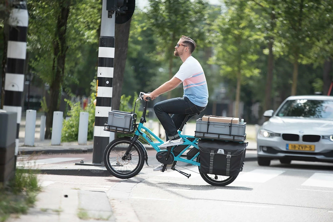 The GSD is an awesome touring machine. It’s got room for six Ortlieb bags (4 on the rear rack and 2 on the front), and a range of up to 250km. A bit of careful packing lets you bring a full touring load, together with a little passenger. That means two GSDs let a family of four tour the world, no bike trailer required.